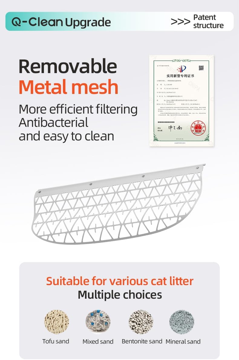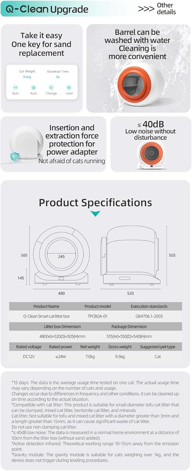 Transform your cat care routine with the Tonepie Q-Clean Smart Cat Litter Box, a revolutionary solution that combines intelligence with convenience. This spacious automatic litter box features a generous 70L capacity, accommodating cats up to 9kg, with a 9L waste bin that requires emptying only every 10 days for single-cat households. The smart system includes app connectivity for remote monitoring and multi-cat recognition, allowing you to track your pets’ habits individually. The innovative design incorporates a new detachable metal mesh and intelligent dynamic purification spray, ensuring thorough cleaning while preventing litter scatter. Operating at just 40dB, this quiet performer won’t disturb your home’s peace. The ozone deodorization system effectively manages odours, making it suitable for any room placement. With its sleek white exterior and distinctive orange accent, this smart litter box combines modern aesthetics with practical functionality. The easy-to-disassemble structure facilitates quick cleaning of dirty parts, while the compact footprint maximizes interior space efficiency. Regular firmware updates via the app ensure your litter box stays current with the latest features and improvements.